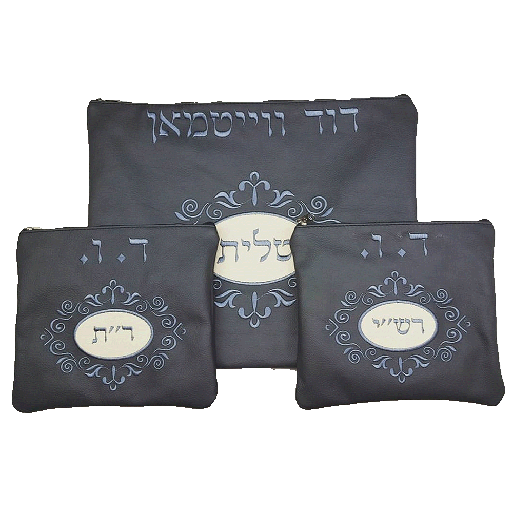סט לחתן מעור איכותי ומשובח עבודת יד הסט כולל: *שני תיקים לתפילין *תיק גדול לטלית *רצועת נשיאה *תיקי אישי לצדקה *ריקמת שם על שלושת התיקים (ללא תוספת תשלום).